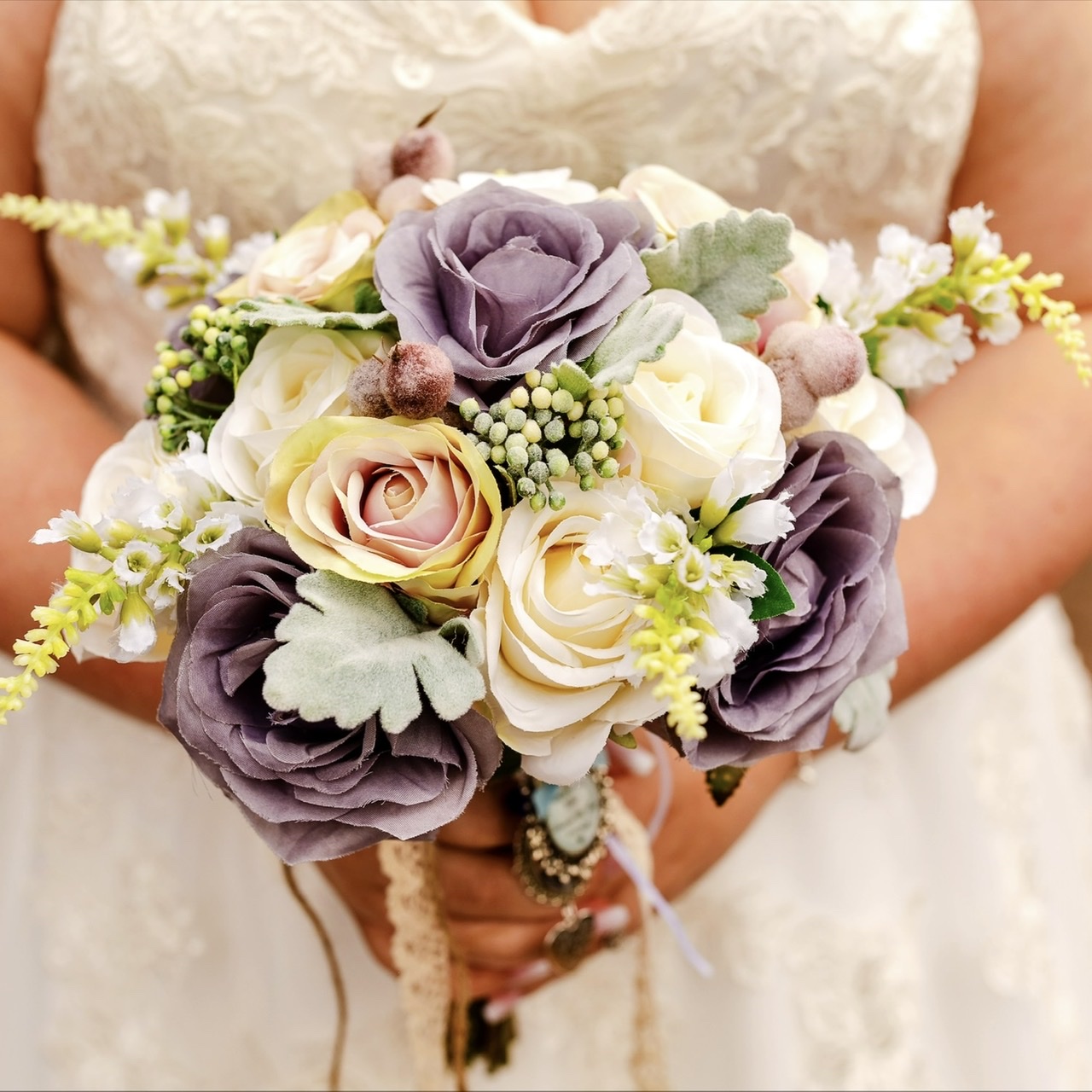 The Jessica, Artificial Silk Rose, Physostegia, Berry and Dusty Miller Brides Hand Tied Bouquet